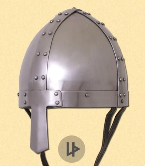 Early helmet, Norman or Viking helmet. The helmet has an adjustable inlay and a chin strap. Heavy quality. 1.6 – 3.2 mm. steel. Nasal 3 mm. steel.