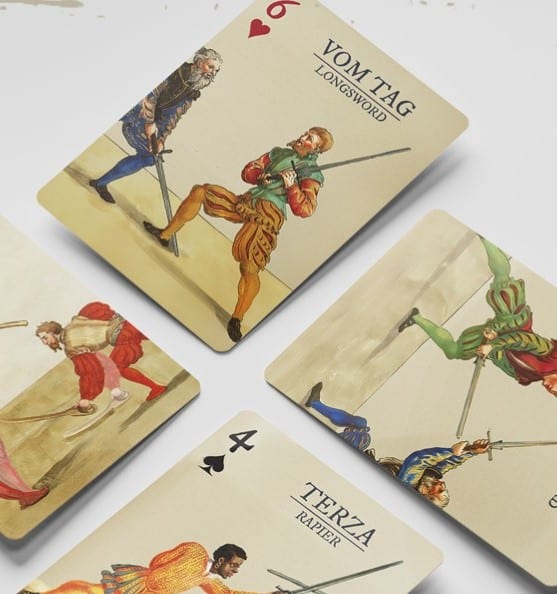 In the Spades (Rapier) suit, you’ll find cards with positions and techniques such as: Prima, Seconda, Terza, Quarta, Affondo, Finta, Cavazione, Mandritto and Riverso, Passata Sotto, Rapier Parts, Spain Rapier & Dagger, Italy Spain Rapier & Dagger, Swept Hilt Rapier.