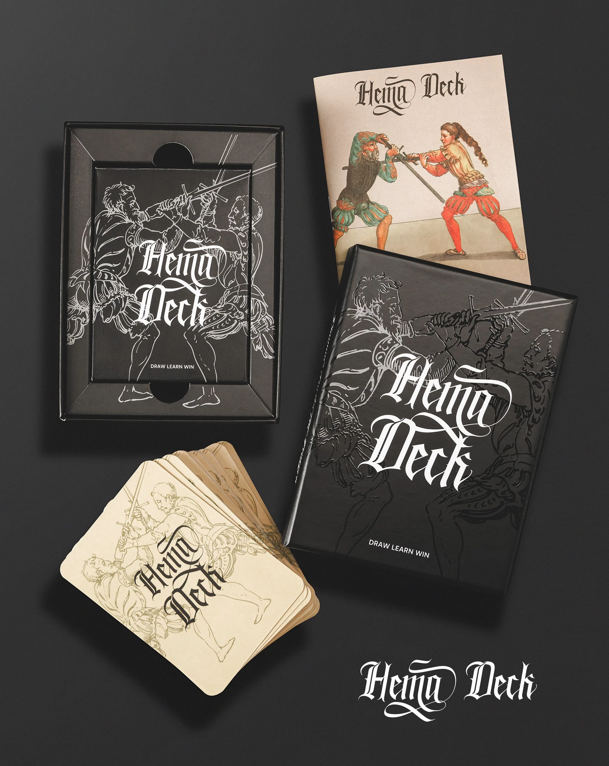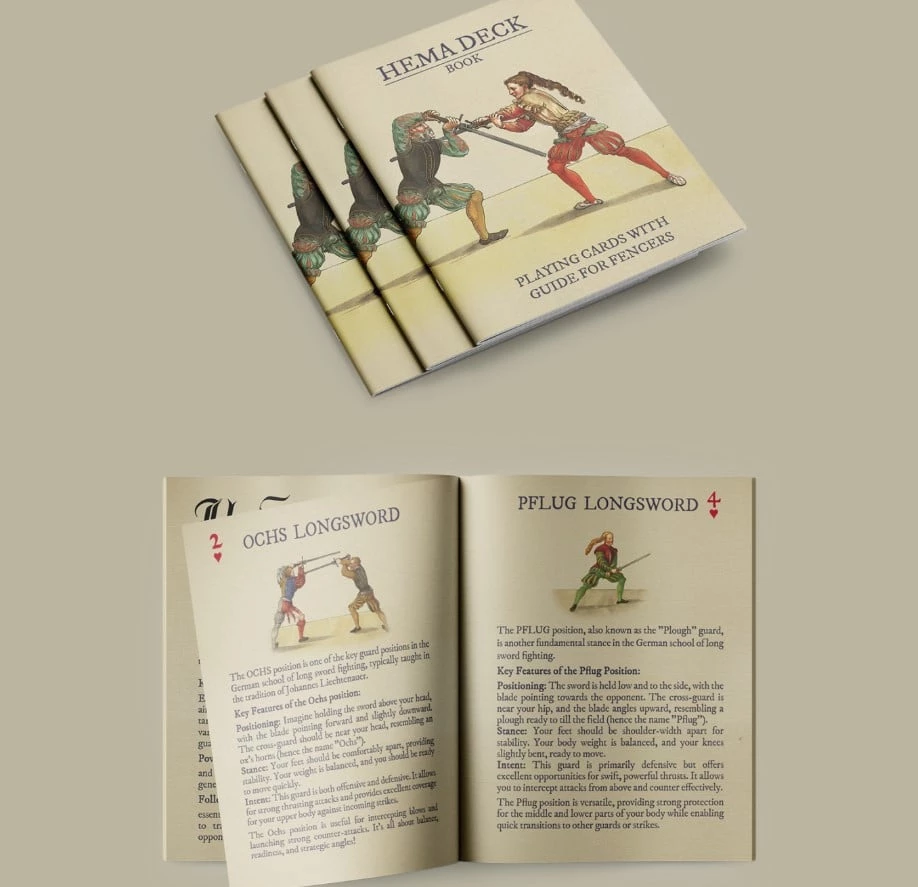 HEMA DECK is een uniek kaartspel geïnspireerd op historische Europese krijgskunsten. Elke kaart toont technieken en houdingen uit historische schermbronnen, geïllustreerd op een duidelijke en toegankelijke manier. Het kaartspel is ontworpen om zowel beginners als instructeurs te helpen en introduceert essentiële basisprincipes voor vier kerndisciplines van HEMA: