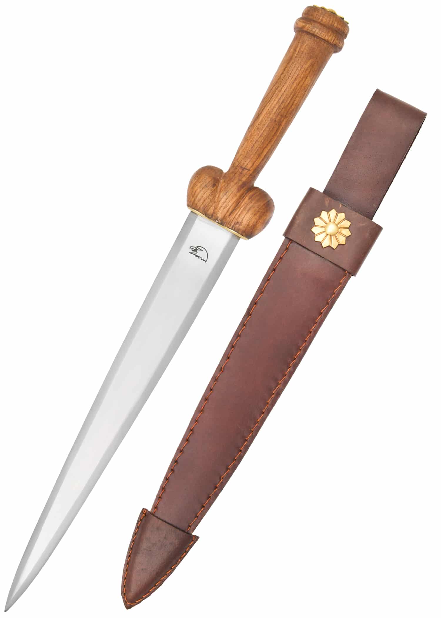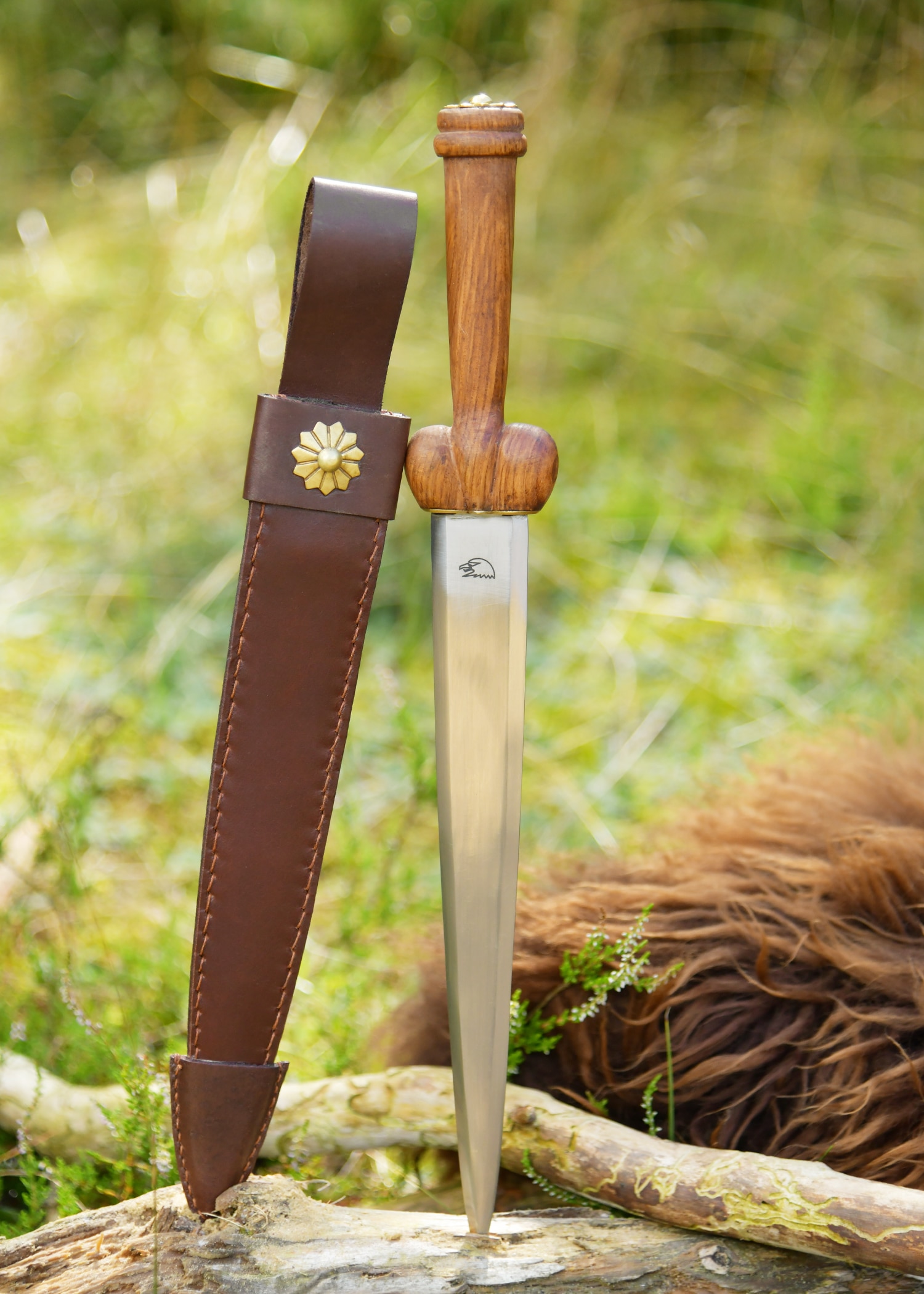 – Material: blad gemaakt van carbon steel, houten greep, leren schede met messing decoratie.