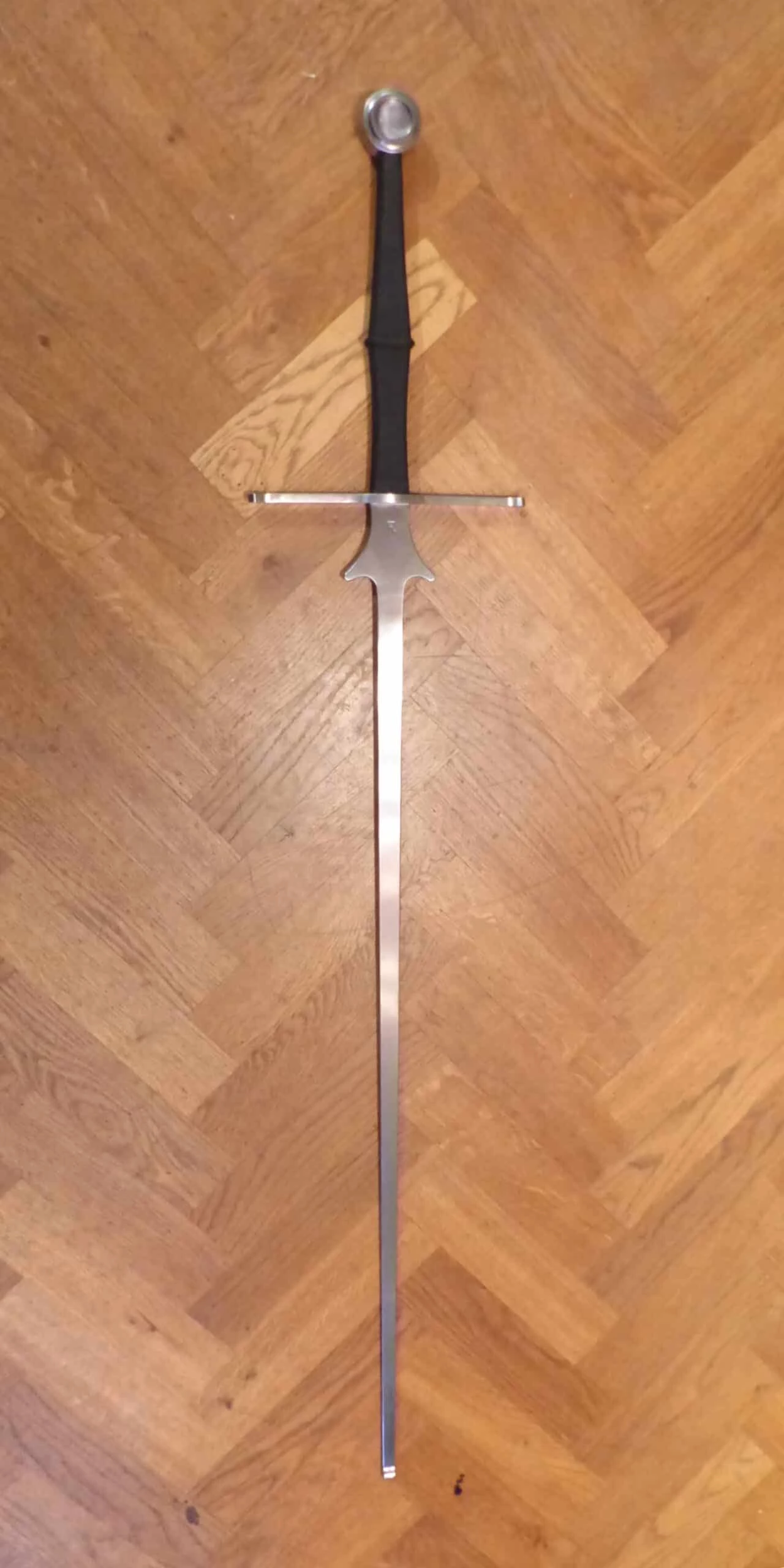 De greep is rechthoekig – getailleerd , afgewerkt met zwart gewikkeld koord.